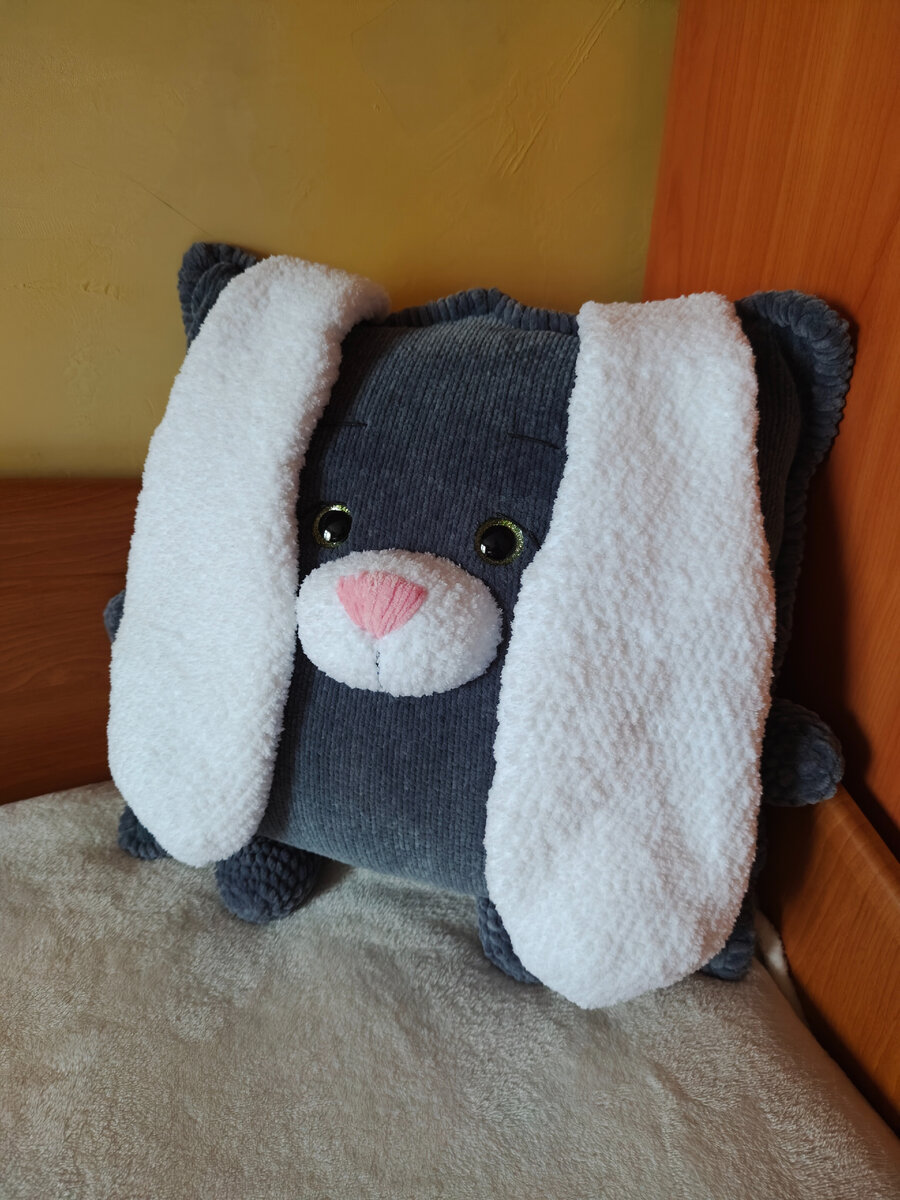 Яркие, нежные, нарядные получились подушечки...даже лучше чем были задуманы изначально. Началось все с зайчика. Приближался 2023 год зайца (кролика) и персонаж для реализации сразу был определен. Основа для подушки 40 на 40 и плюшевая пряжа нужных цветов у меня были. Немного расчетов, набросок, выкройка в реальном размере из бумаги и дальше воплощение в жизнь. Чтоб не скучно было, одна сторона была сделана серым, кроличьим цветом, а вторая ярко желтым. Дальше "Остапа понесло"))) У меня всегда в наличии есть запасы пряжи. Была упаковка яркого рыже-оранжевого цвета. Кто бы это мог быть?!))Ваши варианты?;) Я обожаю лис. Конечно ни как питомцев, а как красивое, всегда нарядное, яркое дикое животное, очень узнаваемое и притягивающее взгляды. Итого, выбор персонажа был очевиден. Так появилась вторая подушка-игрушка Лиса, которая позднее уехала в Калининград. Ну и последним персонажем для подушек мною связанных по, заказу моего ребенка, стал енот. Как же без него, когда в доме уже коллек