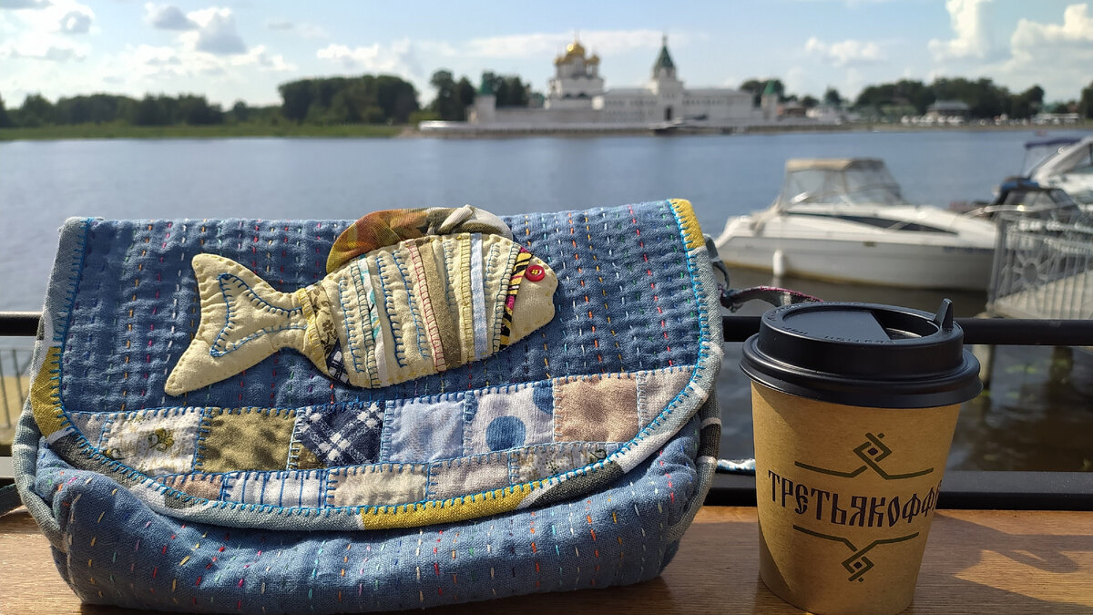 Золотая рыбка - лоскутная вышитая сумка на берегу речки Костромы с видом на Ипатий. 3 путешествия: по Волге, во времени и к вышитой России