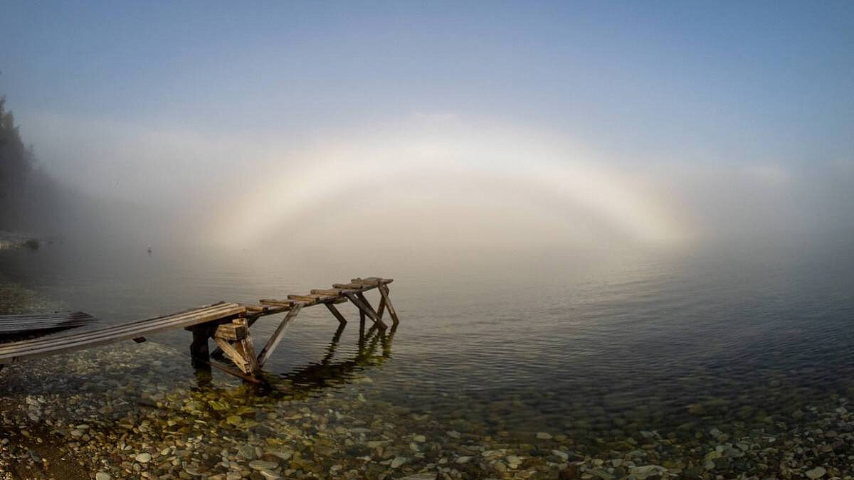 На Байкале наблюдали редкую радугу-альбиноса Накануне на озере Байкал туристы и местные жители наблюдали необычное природное явление — белую радугу. По словам специалистов, радуга-альбинос образуется в тумане благодаря рассеиванию света в мельчайших каплях воды — меньше 25 микрон в диаметре. Если же размер капель будет больше, то на небосклоне появляется классическая семицветная радуга. Ещё больше новостей на сайте «Изнанка»