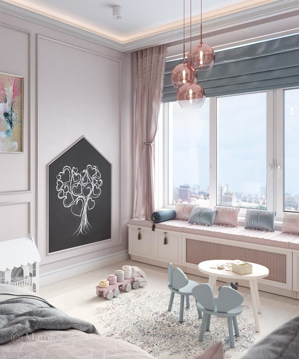 Оригинальный проект деткой для девочки с нежным оформлением. Смотрите подробнее по ссылке Этот удивительный проект доказывает, что даже небольшую спальню площадью 16 м2 можно превратить в настоящий сказочный уголок. Атмосфера волшебства начинается с отделки. Пепельно-розовые панели смотрятся красиво и нежно. Но для стены возле кровати дизайнер выбрал еще более интересное оформление – великолепный горный пейзаж далекой планеты, над которой взошло две луны. Кровать с широким спальным местом от Mamka дополнена мягкой спинкой в форме зайчика с высокими ушками. Такая необычная мебель точно понравится маленькой принцессе. На фоне мультяшной кроватки стильно смотрится прикроватный столик с круглой зеркальной столешницей. Для этой спальни дизайнер выбрал несколько системы хранения. Справа и слева от двери расположены два шкафа с антресолями со схожим дизайном, но разными габаритами. Они легко поместят всю детскую одежду, включая объемные курточки и шубки. Еще одна система хранения – шкаф со ст