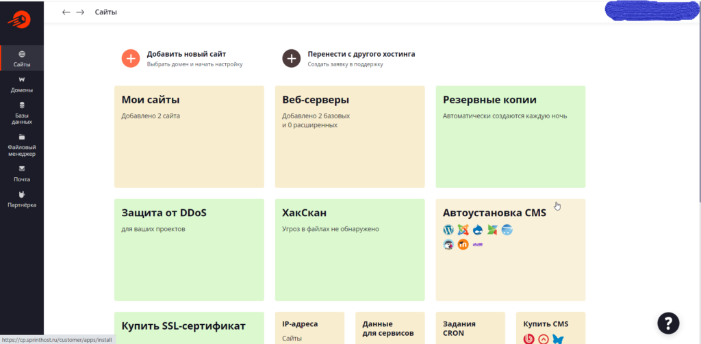 Приветствую товарищи и друзья! Сегодня поговорим о такой вещи как надёжный, простой и удобный хостинг. Исторически сложилось, что с 2016 года я работаю с ребятами из Sprinthost ссылка кликабельна и принесёт вам небольшой бонус при заказе услуг хостинга. Остановился на них потому, что даже тогда их условия (тарифы) простота работы и космический (без тени иронии) уровень поддержки остаются для меня в российском сегменте хостингов самыми лучшими. Итак, с чего начнём? Правильно. С панели управления. Здесь и далее будут скрины из моей панели управления, так что некоторая информация будет размыта. Панель управления. После череды обновлений дизайна, ребята остановились на плиточном интерфейсе, на мой взгляд - оптимальное решение. Как видно, доступен очень большой перечень возможностей: Отдельно хочется сказать про поддержку - ребята очень грамотные, ни одно моё обращение не оставалось без ответа, после самостоятельных неудачных попыток настройки редиректов с https на http очень быстро помогл