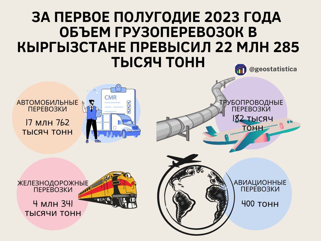 💫 За первое полугодие 2023 года объем грузоперевозок в Кыргызстане превысил 22 млн 285 тысяч тонн. Это на 2 млн 825 тысяч тонн больше (+14,5%), чем годом ранее. 🚚 Автомобильные грузоперевозки — около 17 млн 762 тысяч тонн. Это на 2 млн 103 тысячи тонн больше (+13,4%), чем годом ранее. 🚊 Железнодорожные — свыше 4 млн 341 тысячи тонн. Это на 701 тысячу тонн больше (+19,2%), чем годом ранее. 😉 Трубопроводные — чуть больше 182 тысяч тонн. Это почти на 21 тысячу тонн больше (+12,7%), чем годом ранее. ✈️ Авиационные — 400 тонн. Это на 200 тонн больше (+100%), чем годом ранее. 🇰🇬#Кыргызстан 🔩#Экономика