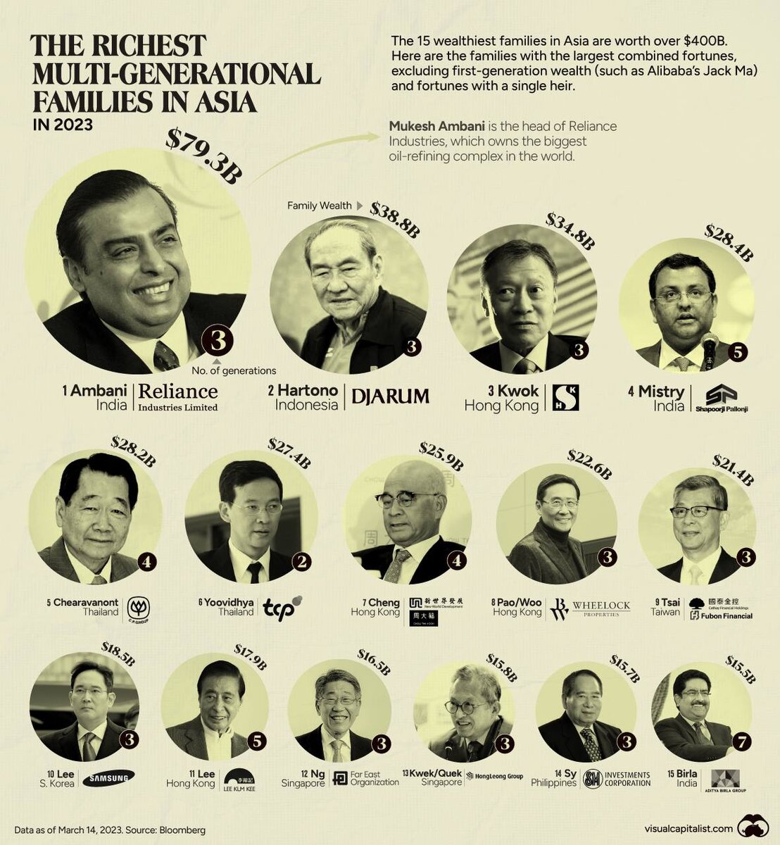 Самые богатые азиатские династии происходят из #Индия, #Индонезия, #Гонконг, #Таиланд, #Южная_Корея, #Сингапур и #Филиппины, но не материкового #Китай. Почему? Потому что политика «реформ и открытости» (китайский НЭП) стартовала только в 1978 году, и за это время еще не успели появиться целые династии миллиардеров. 💰#Финансы