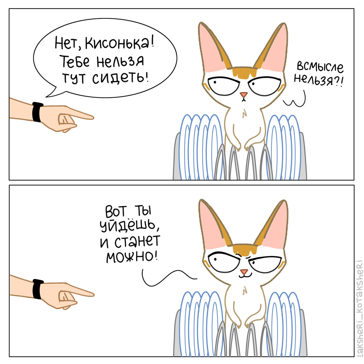 Не хотите получить колкий ответ? Так не задавайте глупых вопросов! Коты сами решают, как им удобнее и полезнее!) А ещё когда им беситься! Потому что коты — самодостаточные существа! Которые упорно борются с человеком за свои интересы) Ну и иногда (только иногда!) нуждаются в человеческой помощи! И иногда нуждаются в человеческом внимании... А как известно, самое ценное внимание — ночное!) В каких комиксах узнали себя и своего кота? Пишите в комментах)