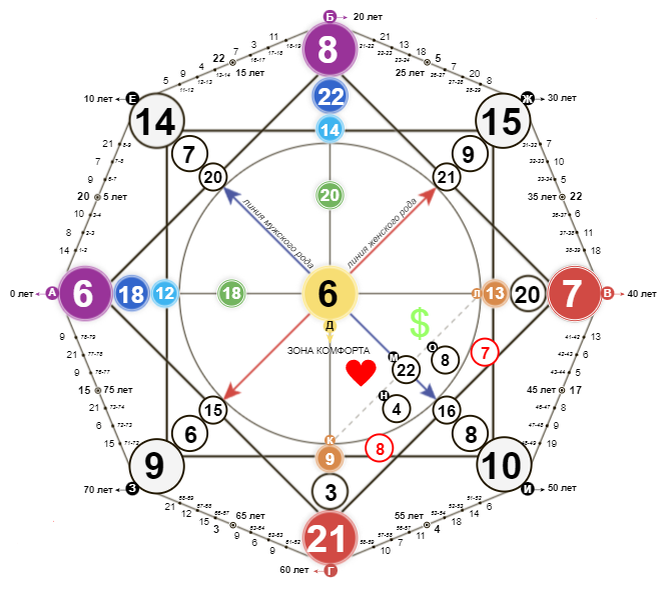 1. Первый калькулятор (которым пользуюсь и я) называется "Белое солнце". Он самый первый, который основан на методе Натальи. И рассчитывает родовой квадрат через зону комфорта (т.Д желтый кружок).
