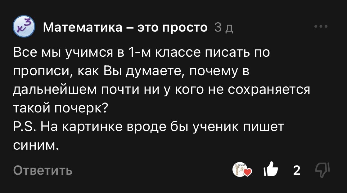 ❓ВОПРОС от подписчика в Дзене: 🙋♀️ Все мы учимся в 1-м классе писать по прописи, как Вы думаете, почему в дальнейшем почти ни у кого не сохраняется такой почерк? P.S. На картинке вроде бы ученик пишет синим. Отвечаю 🤗 📢 Здесь очень много вариантов развития событий. Расскажу про основные. Они характерны начальным классам и тянутся в старшие, если не были исправлены, скорректированы. 1️⃣ Кто-то успевает наработать навык письма за отведённое в школе прописям время, кому-то нужно больше ✍️ 2️⃣ Если у ученика навык не отработан и не закрпелён, то при ускорении скорости письма (это диктанты во 2 и 3 классе), начинается деформация букв. Такое искажение компенсирует затрачиваемое на выведение буквы время 🕰️ 3️⃣ Стрессовое состояние ребёнка сразу видно на письме. Наклон, размер, положение на строке, всё это меняется резко, буквально за день. Чем дольше стресс, тем крепче закрепляется именно этот «стрессовый почерк» 🙆♀️ Для его исправления уже требуется волевое усилие или коррекция. 4️⃣ О