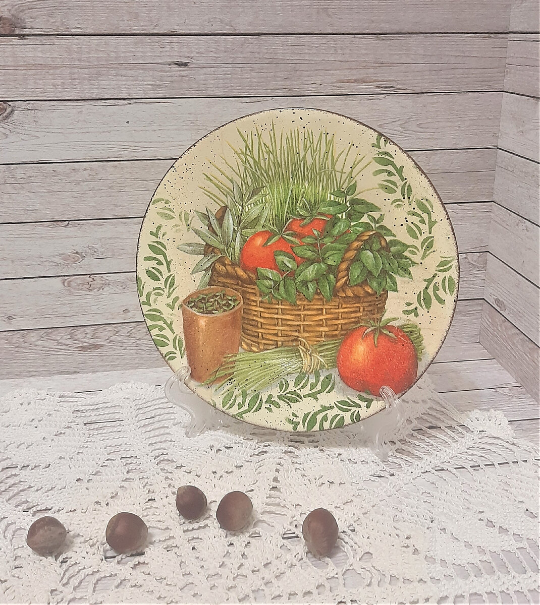 Небольшой мастер-класс для начинающих - как просто, быстро и легко преобразить старую тарелку и сделать новый аксессуар для вашей кухни. Творить будем в технике прямого декупажа, когда наносим рисунок на стеклянную поверхность непосредственно поверх неё, а не снизу, под стекло (тогда это уже будет обратный декупаж). Набор инструментов и материалов минимальный - тарелка, обезжириватель или спиртосодержащая жидкость, акриловые краски, акриловый лак, декупажная салфетка, кисти, спонж, трафарет, наждачная бумага. Итак, тарелку хорошо обезжириваем и покрываем белым акрилом в качестве грунта: Из салфетки вырываем нужный мотив и приклеиваем с помощью ПВА на тарелку: Тщательно просушиваем! В работе со стеклом это даже более важно, чем в декупаже на деревянных поверхностях. После покрываем слоем акрилового лака, снова сушим и шлифуем наждачкой складочки, которые появляются в результате приклеивания. Они будут неизбежно, поскольку поверхность не плоская, а с изгибами. Далее, создаем однородный ф