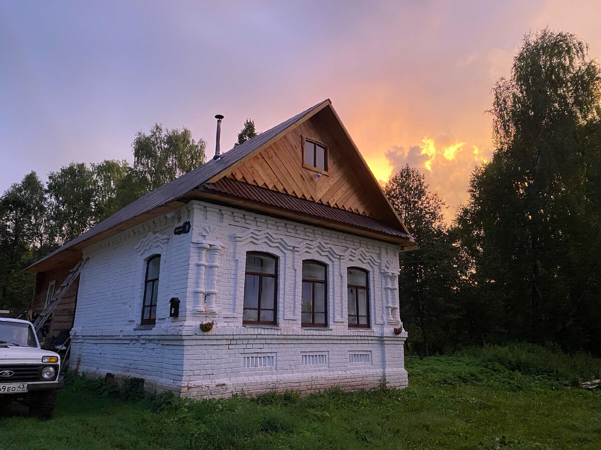 Произошло настоящее чудо − в нашей деревне продавался бревенчатый дом-пятистенок Брежневских времён. Посмотрели − вроде неплохо. Хоть и текла крыша, сгнил потолок, стены оказались в отличном состоянии. Они-то в первую очередь и были. Купили. «Вскрытие» показало, что полы, обрешётка также пребывают в отменном состоянии. Разобрали, перевезли, укрепили фундамент и с некоторыми изменениями собрали три стены, состыковав их с вековой кирпичной кладкой.