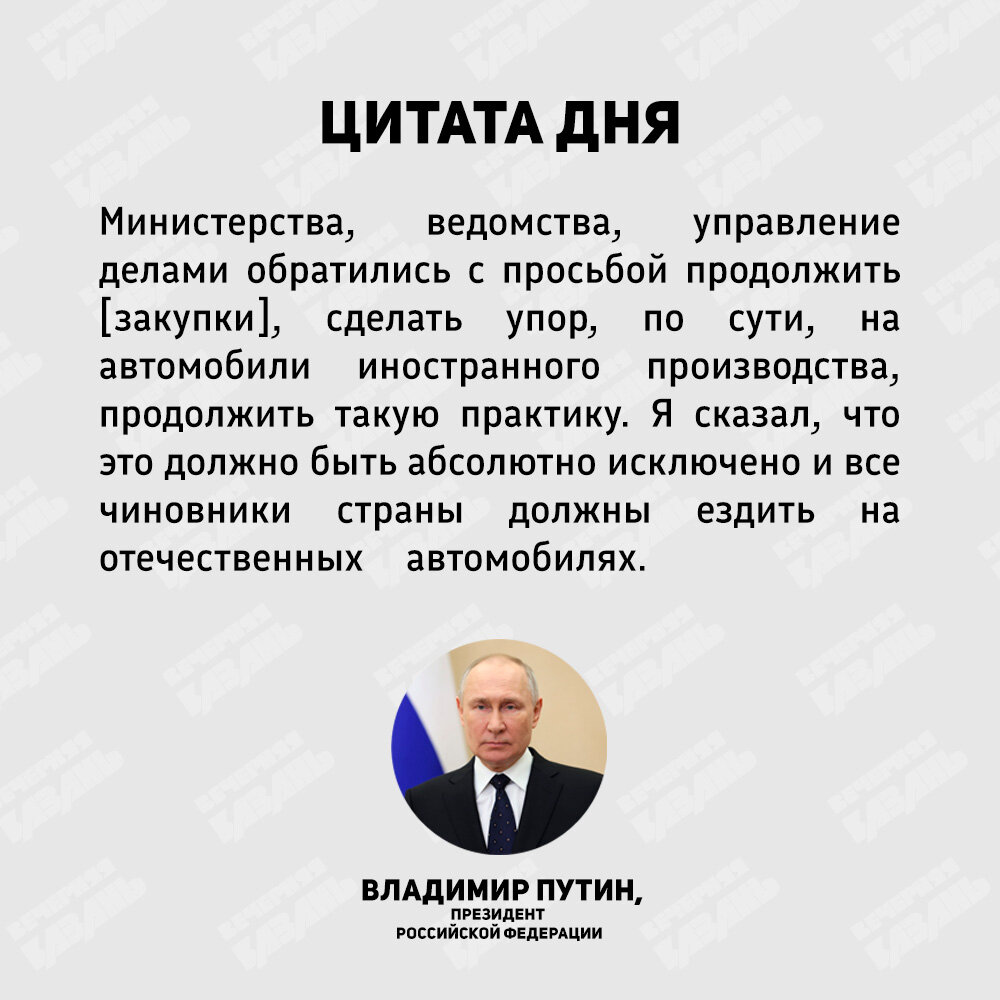 «Где-то будет поскромнее, чем раньше, — ничего страшного, наоборот, даже хорошо. Всё это чиновничество наше замечательное должно понимать, что нужно стремиться к развитию отечественных брендов, отечественных автомобилей и другой отечественной продукции», - заявил президент во время встречи с руководителями предприятий обрабатывающей промышленности.