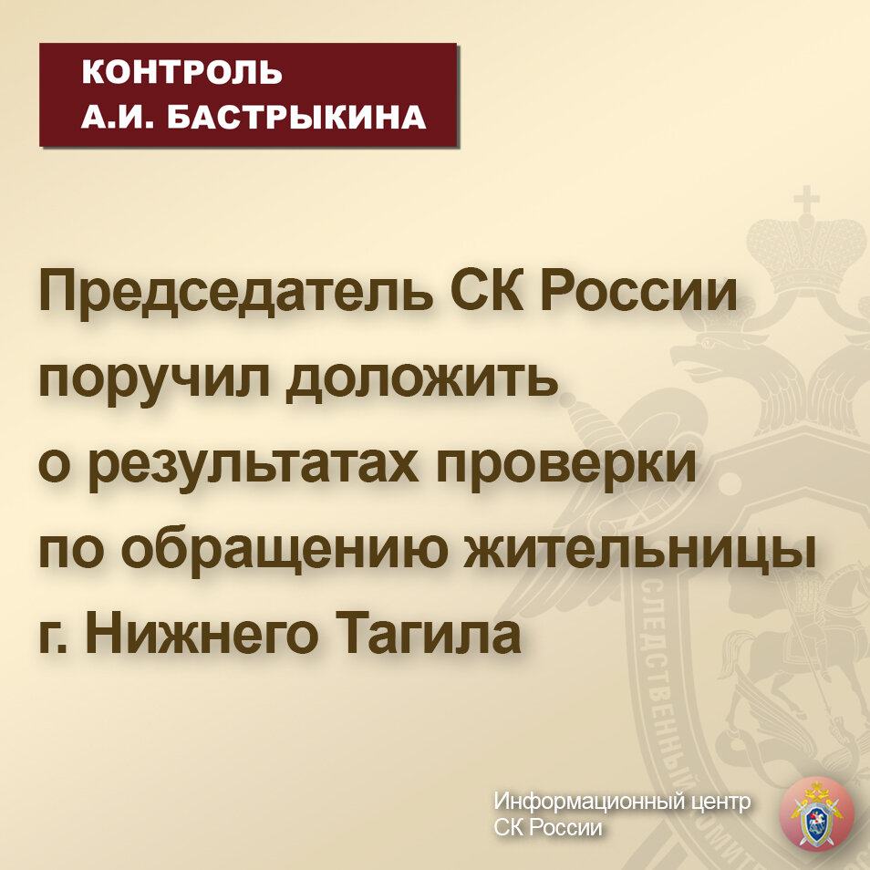 Председатель СК России поручил доложить о результатах проверки по обращению жительницы г. Нижнего Тагила