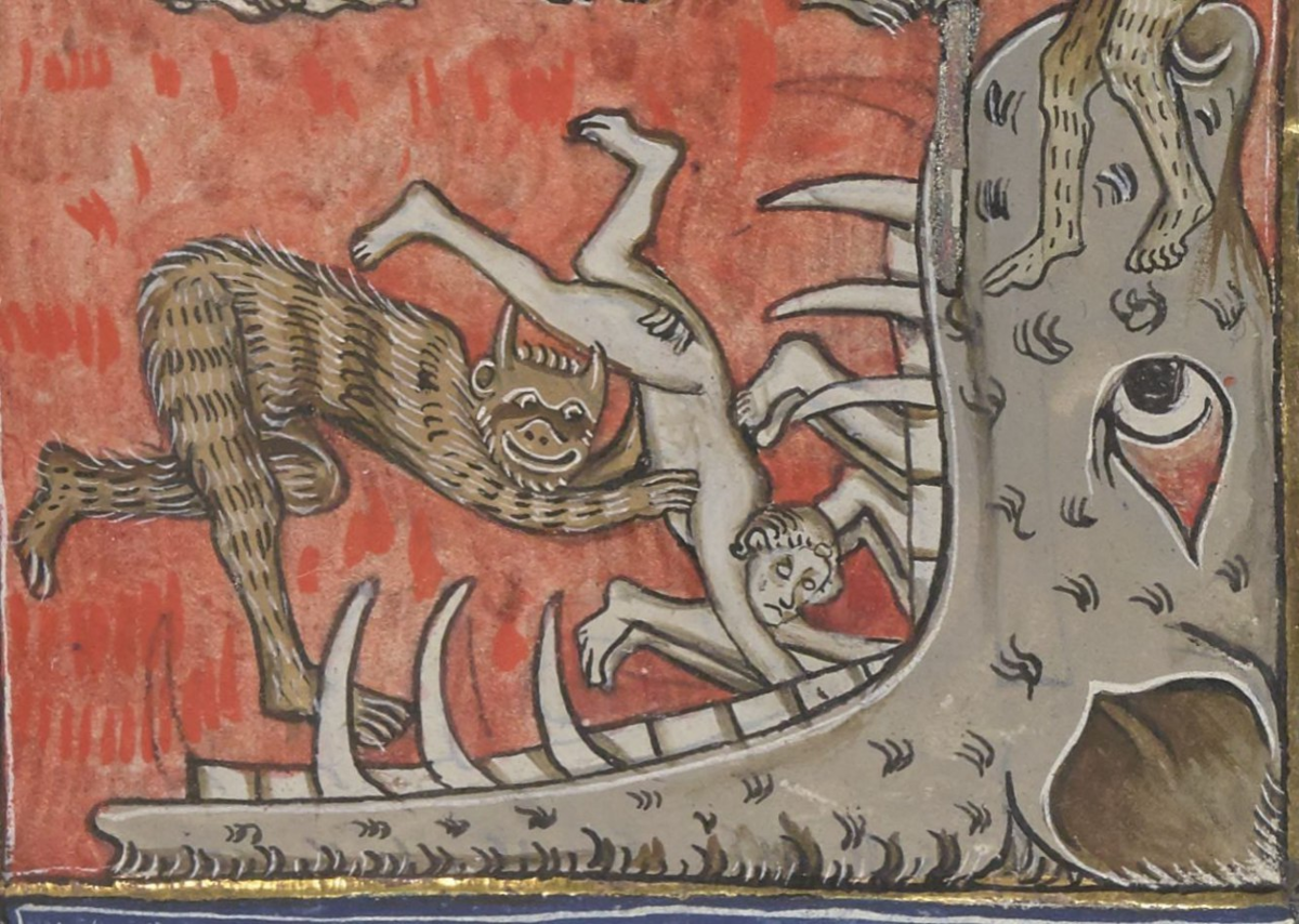 Узнаем, что делают в аду с ростовщиками, адвокатами и "публичными девками", кто ещё сидит за столом рядом с Гитлером и какая музыка там играет. Урок занимательной теологии. 1) Любите ли вы свою работу так, как её любят черти без полного трудоустройства и ОМС? Итак, каким читатель представляет себе ад? Вероятно, у вас появится образ пламени, сернистых испарений и чугунных котлов, где варятся прелюбодеи, "оборотни в погонах" и олигархи. (вечно смотрел бы на это) Но, чаще всего в Средневековье ад представляли в виде разинутой пасти, пожирающей грешников, отталкиваясь от библейских мотивов: "Преисподняя и Абаддон — ненасытимы" (ПР. 27:20), "Как будто землю рассекают и дробят нас; сыплются кости наши в челюсти преисподней» (Пс. 140:7) и т.п.. Самые ранние изображения "пасти ада" относятся к началу XI в. и имеют два основных иконографических типа: пасть либо открывается снизу вверх, и грешники падают в нее, либо открывается горизонтально, и грешники входят в нее. Часть страницы из французско