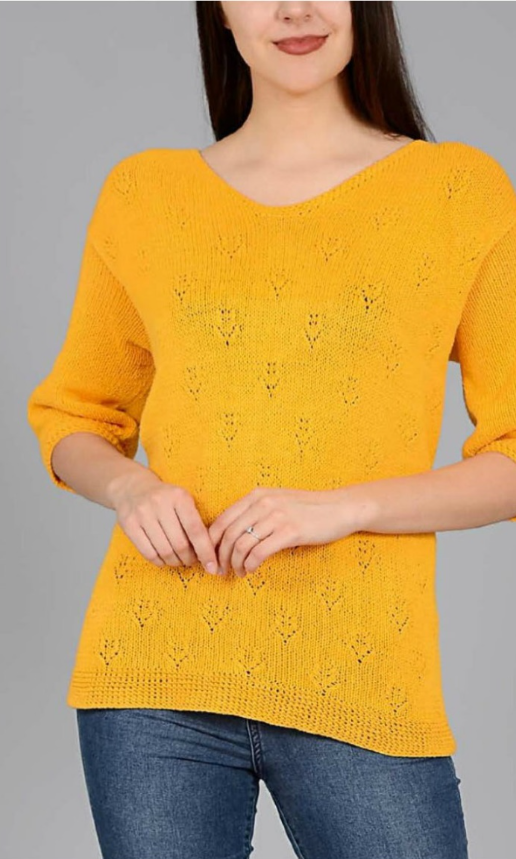 Продолжаем изучать модели пуловеров желтого цвета. Начало статьи здесь >>>>>>>>>>>>>> 1. Пуловер с очень простым ажурным рисунком. Изящные маленькие цветочки украшают основное полотно пуловера. Рукав три четверти и V-образный вырез горловины. Вот и все. Но за такой простотой модели кроется огромная элегантность. 2. Пуловер горчичного цвета. С рукавами реглан и интересным решением в виде сетчатой кокетки переда. 3. Пуловер с воланами. Из узоров использованы резинка 1х1 и лицевая гладь. Расклешенные за счет воланов рукава хорошо сочетаются с расклешенным низом пуловера. 4. Ажурный желтый пуловер. Узор притягивает внимание. Шишечки, арановые частичные переплетения, ажурные галочки - все элементы красиво подобрались в этом узоре. 5. Пуловер с красивым рельефным узором. Этот узор образован за счет вытянутых петель. 6. Элегантный сетчатый пуловер. Простой ажурный рисунок и летний яркий цвет - основные элементы этого классного пуловера. 7. Яркий пуловер. Выполнен вязки "в рубчик" резинкой 1х1