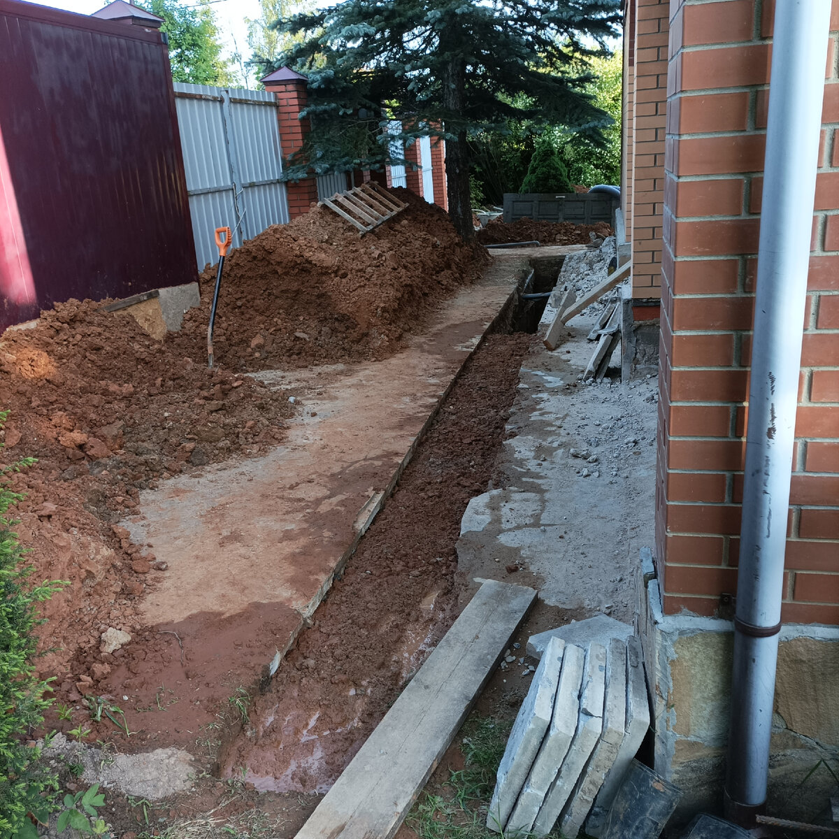 Любая переделка тянет за собой кучу других переделок. А уж если переделки касаются земляных работ... Кучи становятся реальными , приобретая масштаб и объем. А дела, которые потянули за собой эти кучи, становятся неизбежностью, которую хочешь не хочешь придется делать, причем чем раньше, тем лучше. Еще ничего, когда вся земляная махина сваливается на первых этапах освоения участка. А когда участок уже освоен? Когда сад растет и цветет, дорожки, отмостки и прочие атрибуты благоустройства уже есть? Вот тогда, считай, катастрофа. Для примера посчитаем сколько лишней земли (практически всё глина) осталось после ряда земляных работ на том участке, где мы сейчас проводим работы. Итак: 1. Траншеи под дренаж. Вынуто земли - 37,5 м.куб. Обратно в траншеи засыпано около 30 м. куб. Реально меньше, земля ведь отсыпалась назад рыхлая, ей еще оседать и оседать. Внизу, в траншее слои щебня и песка, плюс сама дренажная труба. Все это занимает объем. Ну пусть осталось примерно 8 м. куб. земли. 2. Углу