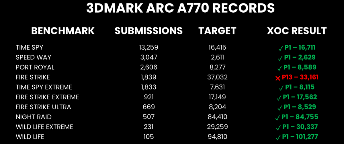 Intel позиционирует свою настольную видеокарту Arc A770 как плату среднего класса для игр. Многие видеокарты среднего класса имеют заводской разгон, но применение экстремального разгона к таким графическим процессорам не слишком распространено, так как не имеет практического смысла. Но SkatterBencher решил установить рекорд для самого быстрого графического процессора Intel Arc и оснастил свою Acer Predator BiFrost A770 системой охлаждения с жидким азотом, добившись впечатляющих результатов. SkatterBencher удалось увеличить частоту графического процессора Intel Alchemist до 3586 МГц по сравнению со стандартной тактовой частотой 2400 МГц. Конечно, на этом уровне графический процессор стал очень нестабильным, и оверклокер мог поддерживать работу карты на этой частоте только в течение нескольких секунд, после чего система зависала, что требовало её перезагрузки. Во время процесса разгона температура графического процессора колебалась около -50°C. Результаты разгона также сильно различались