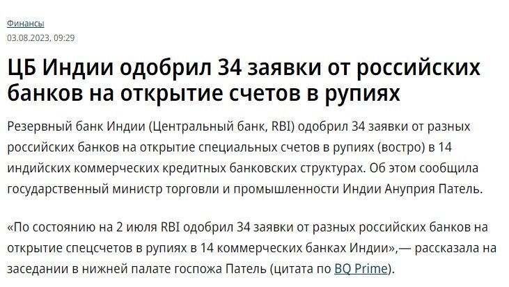 Ну что... Помните все новости про застрявшие миллиарды долларов в рупиях на индийских счетах? Я сам об этом писал несколько раз, например, вот: И что вы думаете? Признали ошибку? Сделали выводы? Что-то поменяли? Как бы не так! Российские банки продолжают активно открывать счета типа "востро" в Индии. Это те самые счета, на которых потом "застревают" рупии! По данным государственного министра торговли и промышленности Индии Ануприи Патель, по состоянию на 2 июля текущего года Резервный банк Индии (так называется их ЦБ) одобрил 34 заявки от российских банков на открытие счетов типа "востро" в рупиях. Я напомню, что на конец прошлого года (когда только были достигнуты договоренности о переводе экспортных расчетов на рупии) таких банков было только 5. То есть, почти 30 банков добавились уже в текущем году, и многие из них явно - уже после того, как стала известна проблема с выводом рупий. Я поясню, что счет востро - это счет, открываемый за рубежом в местной валюте. Такой счет принадлежит
