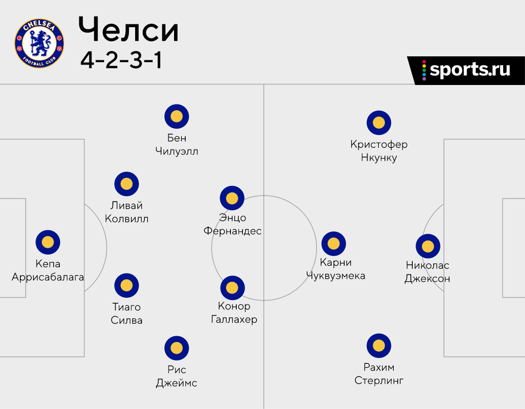 Состав выглядел сбалансированно. Пару центральных защитников составили Ливай Колвилл и Тиаго Силва, Энцо Фернандес и Конор Галлахер встречали соперников в центре поля, Рахим Стерлинг и Рис Джеймс рассекали по правому флангу, а Кристофер Нкунку и Бен Чилуэлл – по левому. Николас Джексон играл на острие.