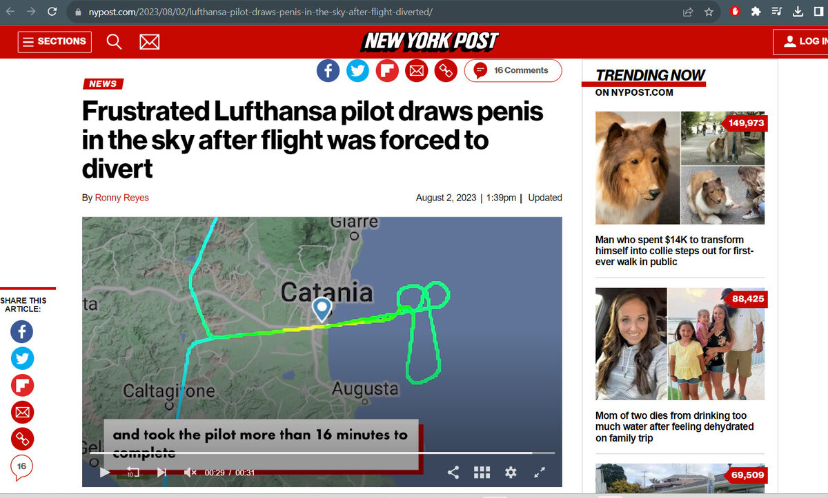 Раздраженный пилот Lufthansa нарисовал пенис в небе Пилот европейской авиакомпании Lufthansa нарисовал пенис в небе своим самолетом, когда ему не разрешили сесть в аэропорту сицилийского города Катания. Об этом стало известно 3 августа из публикации New York Post со ссылкой на итальянские СМИ. Аэропорт не дал разрешения на посадку из-за ограничения количества рейсов после недавнего пожара. Утверждается, что пилот оказался раздражен и начал рисовать в небе мужской половой орган. Траектория его рейса оказалась записана сервисом Flight Radar. На создание пениса, как пишет издание, ушло 16 минут. Затем самолет отправился на юг к новому пункту назначения — на остров Мальта. В Lufthansa заявили, что фаллический рисунок вышел случайно — пилот кружил в небе, прежде чем ему назвали новое направление.