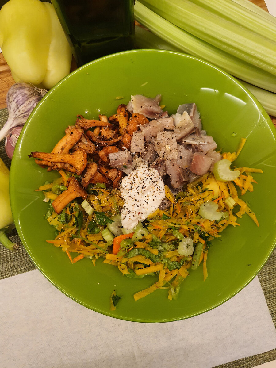 1. Салат из свежей тыквы с авокадо и лисичками. Сельдь.