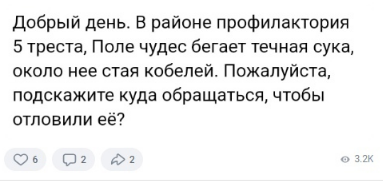 Как всегда жалоба, прямо стая, страшно, отловите! Поехали посмотреть, так как нестерильных собак в городе можно по пальцам пересчитать, кого мы пропустили помимо тех, кого пока отловить не можем? Приезжаем и возле мусорки обнаружили ЦЕЛУЮ СТАЮ! Двух собак: Странно, должна быть стая. Объехали квартал, больше никого не обнаружили, поговорили с двумя тётушками, они не в курсе, других собак не видели, но да, вроде бы у этой красавицы течка.