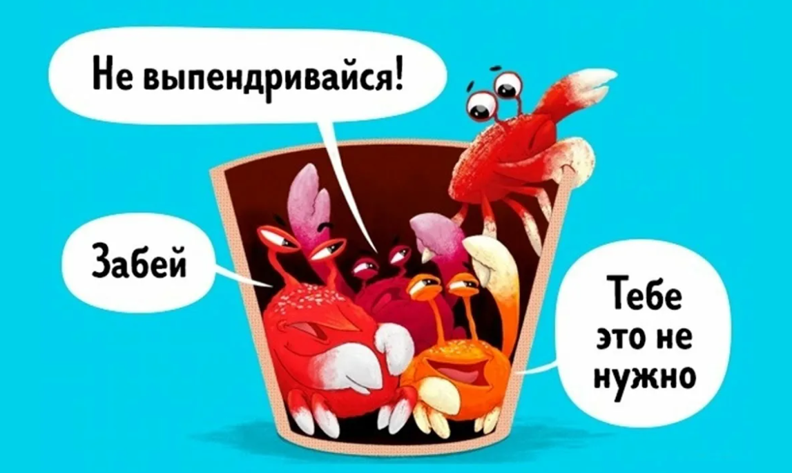 Существует феномен, который называется "эффект ведра с крабами". С большей вероятностью один краб выберется из ведра, чем когда в этом ведре крабов много, они хватаются друг за друга и не дают никому выбраться. Этот термин описывает ситуацию, когда один человек пытается подняться или развиваться, а окружающие, вместо поддержки, тянут его обратно и пытаются удержать на прежнем уровне, при этом подвергая человека критике, обычно неконструктивной, и выливая на него свой негатив и обесценивая.