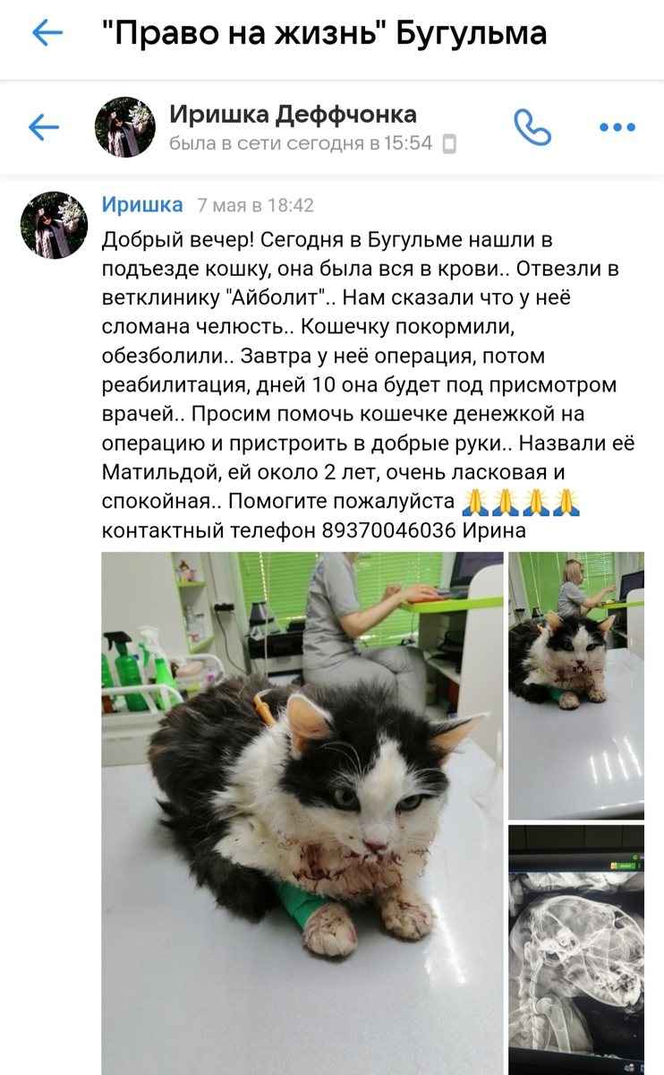Мы очень много говорим о собаках, но и кошечек, нуждающихся в помощи у нас немало. Вот, например, такой случай. Обратилась к нам девушка, что у себя в подъезде она нашла истекаю_щую кро_вью кошку. Надо сказать и отдать ей должное, девушка не пыталась, как это часто бывает, сдать нам кошечку, она просила помощи в оплате лечения, так как сумма была неподъёмной для неё. Она сама увезла животное в клинику соседнего города, часть суммы за лечение оплатила сама, открыла сбор на своей страничке для бедолаги.