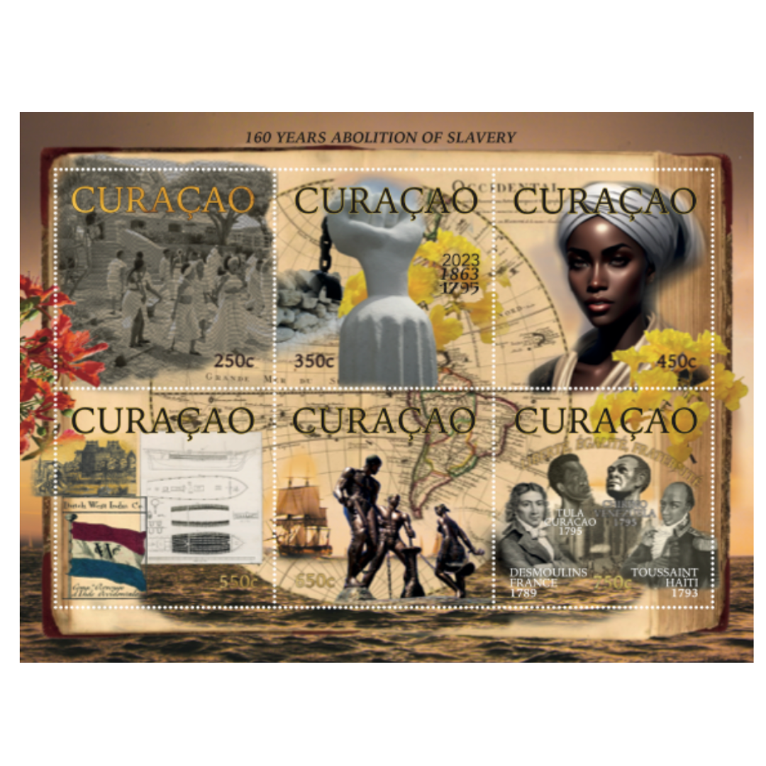 Cpost International с гордостью представляет выпуск шести марок, посвященный 160-летию отмены рабства. На первой марке слева в верхнем ряду 250c на заднем плане изображен плантационный дом «Книп». Именно здесь в 1795 году началось восстание рабов на Кюрасао. Также за свободу боролись порабощенные женщины. Средний штамп 350с в верхнем ряду показывает кулак борьбы за свободу и цепь с открытой дужкой. Он был разработан Юби Кириндонго и размещен на 7 ключевых местах борьбы за свободу, которая произошла на Кюрасао в 1795 году. На правой марке в верхнем ряду 450c изображен портрет афро-карибской женщины, которая выражает силу, красоту, достоинство и благодать. Цветы кибрахача, украшающие ее, отражают яркость, красоту и силу, поскольку эти деревья могут выживать без воды в течение длительного периода времени. Левая марка 550c нижнего ряда посвящена трансатлантической работорговле и голландской WIC (Вест-Индской компании), которая торговала порабощенными людьми из африканских стран в Америку.