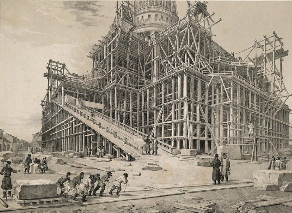 Если разсматривать чертежи, имеющиеся в книге Монферрана "Eglise Cathedrale de Saint-Isaac" 1845 года, то мы легко обнаружим у лесов те элементы конструкции, которые возпринимают горизонтальную составляющую нагрузок.