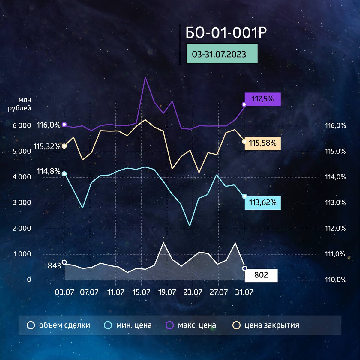 Суммарный объем торгов на вторичном рынке по трем биржевым выпускам эмитента составил 78,6 млн рублей. Инвесторы получили перечисленный компанией доход в размере 3,7 млн рублей. Итоги торгов Объем торгов по дебютному выпуску ООО «ГЛОБАЛ ФАКТОРИНГ НЕТВОРК РУС» серии БО-01-001P со ставкой 20% годовых до ноября 2025 г. увеличился с 17 до 20 млн рублей, при этом цена выросла еще в среднем на 0,5% (максимально на 1,5%), доходность к концу месяца упала до 8,5% годовых. Выпуск серии БО-02-001P с купоном 16,5%, размещенный в марте по объемам торгов незначительно снизился с 25,4 до 22,2 млн рублей за месяц, доходность сохранилась на уровне 14% годовых (цена — около 106% от номинала). В целом для выпусков объемом 100 и 150 млн рублей оборот за месяц в размере около 20% от объема эмиссии считается достаточно ликвидным. 26 июля эмитент разместил четырехлетние облигации серии БО-03-001P объемом 150 млн рублей. Всего было заключено 985 сделок. Максимальный объем одной заявки — 10 млн рублей, минима