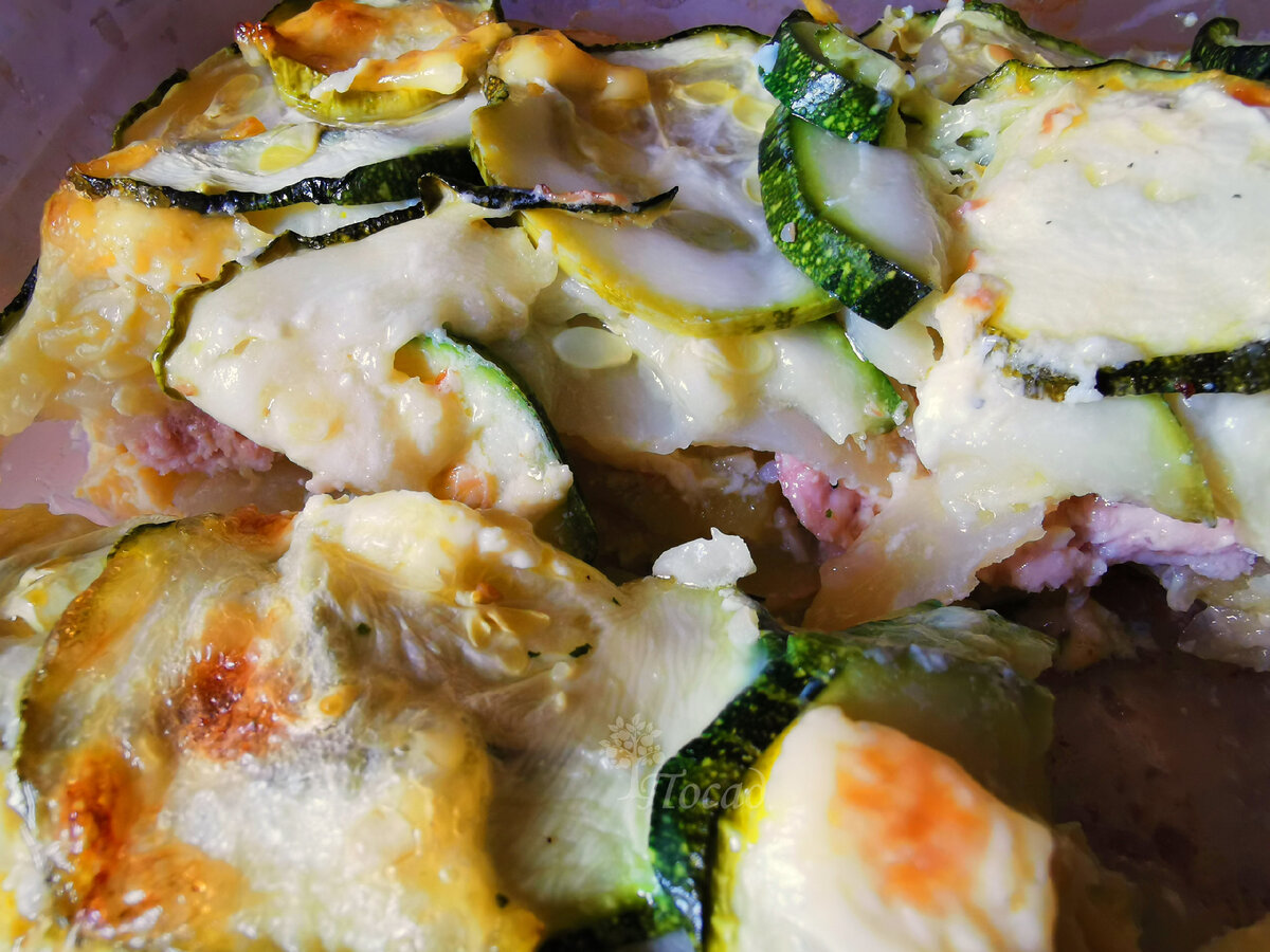 Рано или поздно перед каждой хозяйкой встаёт это вопрос. Кабачки прут, как не в себя, девать их куда-то надо. Все блюда уже приготовлены не по одному разу и назревает кабачковая катастрофа. Если икра закручена, а родные пробегают мимо кузни бодрой рысью (только бы кабачком не накормили), а вы тоже не знаете, как ещё использовать беленьких, полосатеньких и просто зелёненьких, сделайте слоёнку. Уверена, что блюдо станет одним из ваших любимых! С первыми кабачками я начинаю готовить эту вкусняху. Готовлю её практически день-через день. Нет, я не еду на терпеливых родных, сами просят приготовить. Блюдо действительно очень вкусное и уникальное, несмотря на немудрёный состав. Посудите сами – готовится быстро, грязной посуды – минимум, никакой жарки в жиру, да ещё и вкусно. За эти достоинства слоёнку и люблю. Набор продуктов – минимальный: картошка, куриное мясо, кабачок, чеснок и яйцо. Ещё понемногу растительного масла, майонеза, молока и воды. Все продукты, особенно последний, как правило