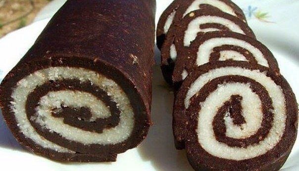 Ингредиенты: - Печенье 200 гр., - Сахар 20 гр., - какао 2 ст.л., - вода 100 мл. - кокосовая стружка 80 гр., - масло сливочное 80 гр., - сахарная пудра 60 гр. Приготовление: 1. Печенье истолочь в крошку, добавить какао и перемешать. Сахар растворить в горячей воде и постепенно добавлять его к измельченному печенью, постоянно перемешивая, должна получиться упругая смесь. 2. Сливочное масло взбить с сахарной пудрой и перемешать с кокосовой стружкой. На пищевую пленку выложить смесь из печенья, сверху равномерно распределить кокосовый крем. Свернуть рулет. Убрать в морозильник минимум на 1 час. 3. Подавать порезав острым ножом на сегменты. Приятного аппетита!