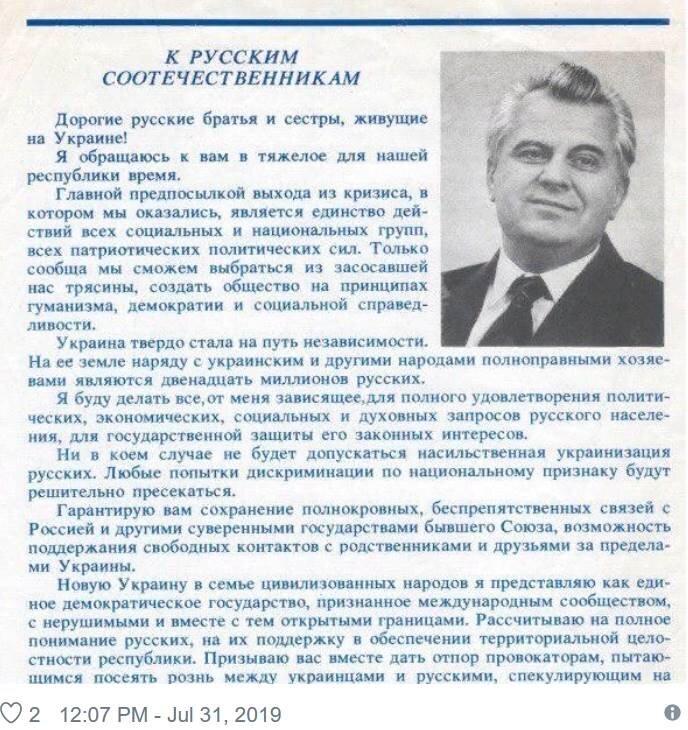 Предвыборная листовка первого президента Украины Л. М. Кравчука с обращением к русским и русскоязычным жителям Украины. 1994 год. «К русским соотечественникам».
