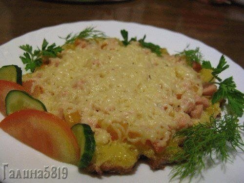 Ингредиенты: -Белый хлеб, я брала только мякиш -Яйцо -Колбаса или отварное мясо -Помидор или другие овощи -Сыр твердый -зелень -специи Приготовление: Хлеб порезать на кубики и смешать с яйцом и специями, хорошо перемешать до однородной массы. Отдельно в тарелке соединить порезанные колбасу и помидор. Сковороду нагреть, налить немного растительного масла и вылить нашу массу. Разровнять ложкой. Сверху выложить колбасу и помидор,посыпать зеленью. Посыпать тертым сыром. Накрыть крышкой и готовить на слабом огне, чтобы растопился сыр,а снизу немного подрумянить. И с пылу жару сразу же подаем на стол. Приятного аппетита!