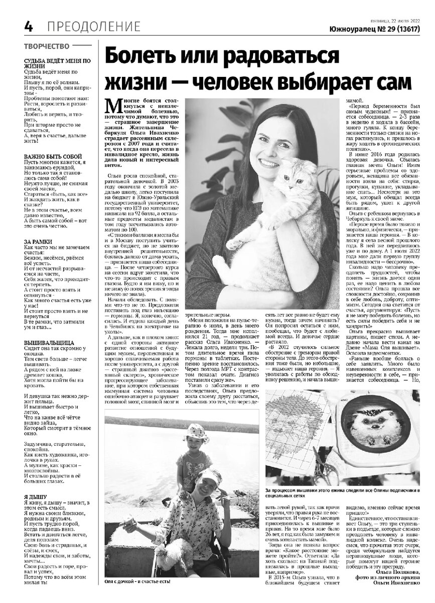 Приветствую Вас, мои дорогие читатели 👋 Мне на месте не сидится, постоянно хочется чего-то нового. Вы, наверно, уже это поняли. А жизнь исполняет наши желания именно так, как человеку будет полезно! Проверено👌 Вся наша жизнь Игра, и выбор за нами, кем быть в ней - зрителями или актёрами 🎭 Как поставили диагноз, Рассеянный склероз с 2007 года я очень боялась оказаться на обочине жизни. Боялась, боялась, а потом решила надо действовать. Как Алиса у Кэролла, падая вниз, наблюдала я, что же такое там в той стороне. Наблюдала, смотрела и, вдруг, поняла, что давно подниматься пора уже мне. В голове сразу план в виде схем и расчётов, изменить как падение сразу до взлёта. Для начала найти надо точку опоры, от которой подпрыгнуть смогу для полёта. Архимед не шутил про опору, он прав – для подъёма никак не взлететь без опоры. Что ей будет и кто мне пока не понять. Буду действовать! Хватит одних разговоров. И пошло поехало)) Год назад в местной газете "Южноуралец" была обо мне статья. На