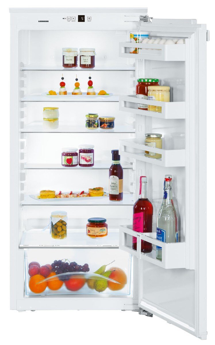 Встраиваемый однокамерный холодильник может устанавливаться в кухонный гарнитур рядом с морозильной камерой. Высота 122 см и ширина 56 см гарантируют отличную вместимость: общий объем модели составляет 229 литров. Дверные петли можно перенавешивать справа налево. Мебельный фасад крепится непосредственно на дверь холодильника, что способствует прочности конструкции. Холодильное отделение размораживается автоматически, при этом на внутренней поверхности камеры не образуется наледь, и очистка стенок не составляет труда. При повышении наружной температуры можно воспользоваться встроенной вентиляцией, равномерно распределяющей холодный воздух в пространстве камеры для лучшего охлаждения. Если предстоит загрузка большого количества продуктов, температуру можно снизить заранее, включив режим суперохлаждения SuperСool. На дверце располагаются регулируемые по высоте полки для бутылок и консервов с удобными держателями. Устройство работает практически бесшумно: уровень шума достигает всего 35 дБ.
