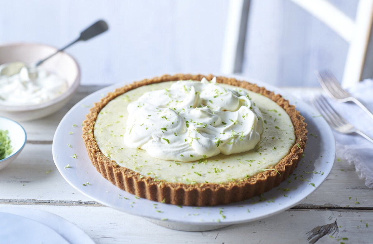 Сделать базу Разогрейте духовку до газа 6, 200°C, вентилятор 180°C. В большой миске смешайте 250 г измельченного печенья со 125 г растопленного сливочного масла. Вдавите крошки в форму Переложите бисквитную смесь в форму для тарта диаметром 23 см со свободным дном. Прижмите к основанию и вверх по бокам формы. Выпекать в духовке 15 минут. Измельчить и выжать сок из лаймов Тем временем нарежьте цедру 4 лаймов в небольшую миску. Раскатайте каждый очищенный лайм на плоской поверхности, чтобы выпустить как можно больше сока, затем разрежьте каждый пополам и выдавите сок, добавив сок в миску с цедрой. Сделать начинку Поместите 1 x 397 г сгущенного молока в миску и добавьте 4 больших яичных желтка (не выбрасывайте яичные белки - из них можно приготовить милые радужные безе ). Используя электрический венчик, взбивайте в течение 1 минуты. Добавьте цедру и сок лайма и взбивайте еще минуту. приготовить начинку Вылейте в форму для тарталеток и верните в духовку еще на 15 минут. Снимите и остав