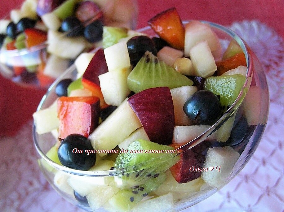 2-3 ст. л. мятного сиропа по моему рецепту: Приготовление: Дыню разрежьте пополам, удалите семечки, нарежьте кусочками. Сливы разрежьте пополам, удалите косточки, нарежьте кусочками, добавьте к дыне. Киви очистите от кожуры, нарежьте, добавьте в салат. Затем присоединить смородину и все перемешайте. Разложите салат по креманкам, полейте мятным сиропом. Подавайте охлажденным. Приятного аппетита!