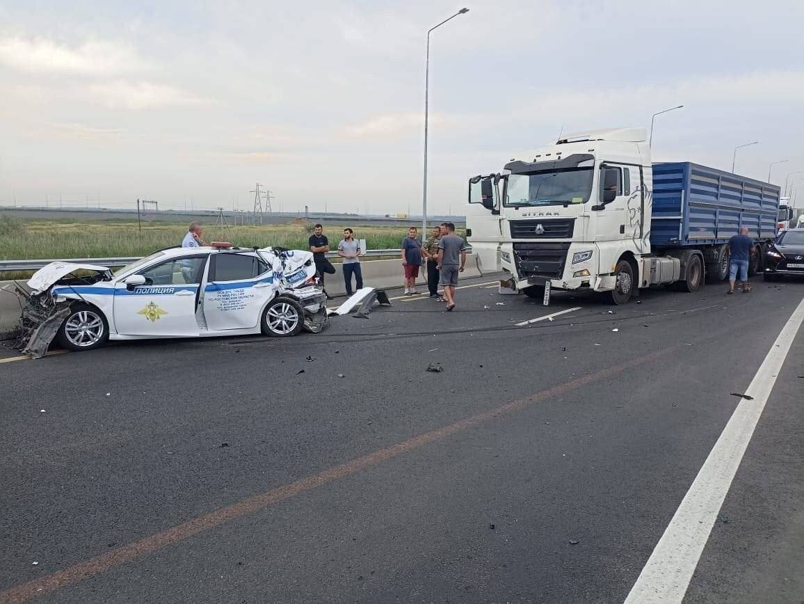 В ГУ МВД региона сообщили, что патрульная Toyota Camry разворачивалась с проблесковыми маячками, а на записи удара их не видно. В Ростовской области на трассе М-4 «Дон» произошло ДТП с участием большегруза и полицейского автомобиля Toyota Camry. Двое сотрудников пострадали. Как сообщила пресс-служба ГУ МВД региона, в четверг, 3 августа, на автодороге М-4 «Дон» в Аксайском районе инспектор ДПС ГИБДД ГУ МВД России по Ростовской области, управляя патрульным автомобилем, по предварительным данным, «при развороте с включенными проблесковыми маячками и звуковым сигналом» допустил столкновение с большегрузным автомобилем. Также в салоне служебного автомобиля находился замкомандира взвода ДПС. В результате ДТП оба сотрудника пострадали. По данному факту проводится проверка, в ходе которой будут установлены все обстоятельства произошедшего и принято решение в соответствии с законодательством, сообщили в донском главке. Меж тем, в сети Интернет появилось видео, на котором слова из официального к