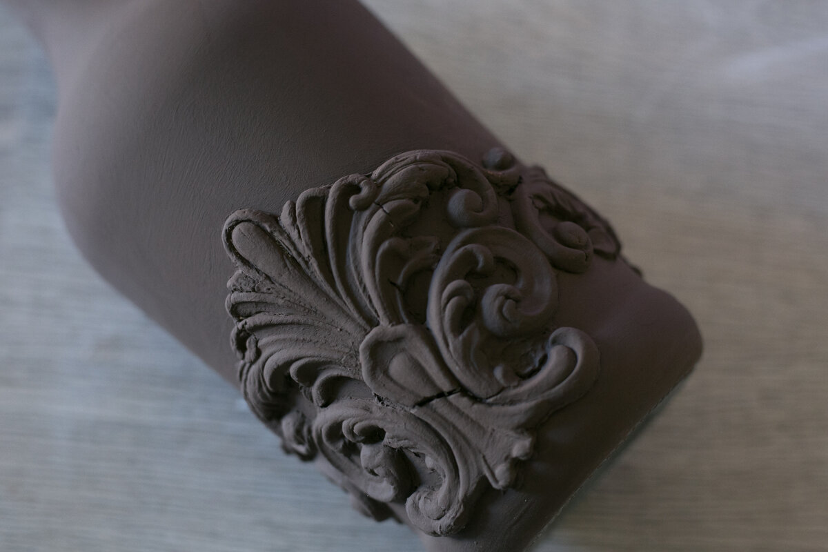 Я довольно часто использую в работе самозатвердевающую массу для изготовления объемных элементов с помощью силиконовых молдов, текстурных ковриков или ручной лепки. Декоративные элементы из массы приклеиваются к поверхности в сыром виде. Именно такой способ позволяет клеить массу на цилиндрические изделия и на углы, и плотно прижимать её к поверхности. Но в процессе высыхания масса почти всегда трескается. Это происходит потому, что в процессе высыхания из массы испаряется вода, и она стремится уменьшиться, но уже не может, так как её крепко держит клей. Разрыв, как правило, происходит в самых тонких местах или в местах, где есть воздушные пузыри. Трещины в массе неизбежны, и нам важно научиться работать с ними и здесь есть два пути. Во-первых, далеко не всегда трещины нужно убирать. Часто мы делаем состаренные работы, которые вполне могли треснуть со временем, и в таких случаях, красивая трещина только добавить вашему изделию шарма и натуральности. Ну а если стилистика работы не подра