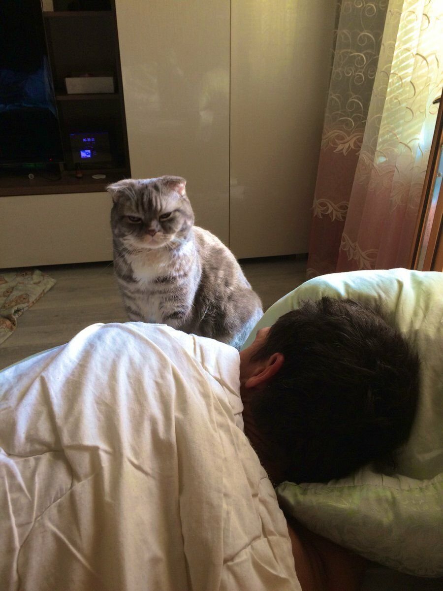 Почему кошка стоит над спящим хозяином и рассматривает его