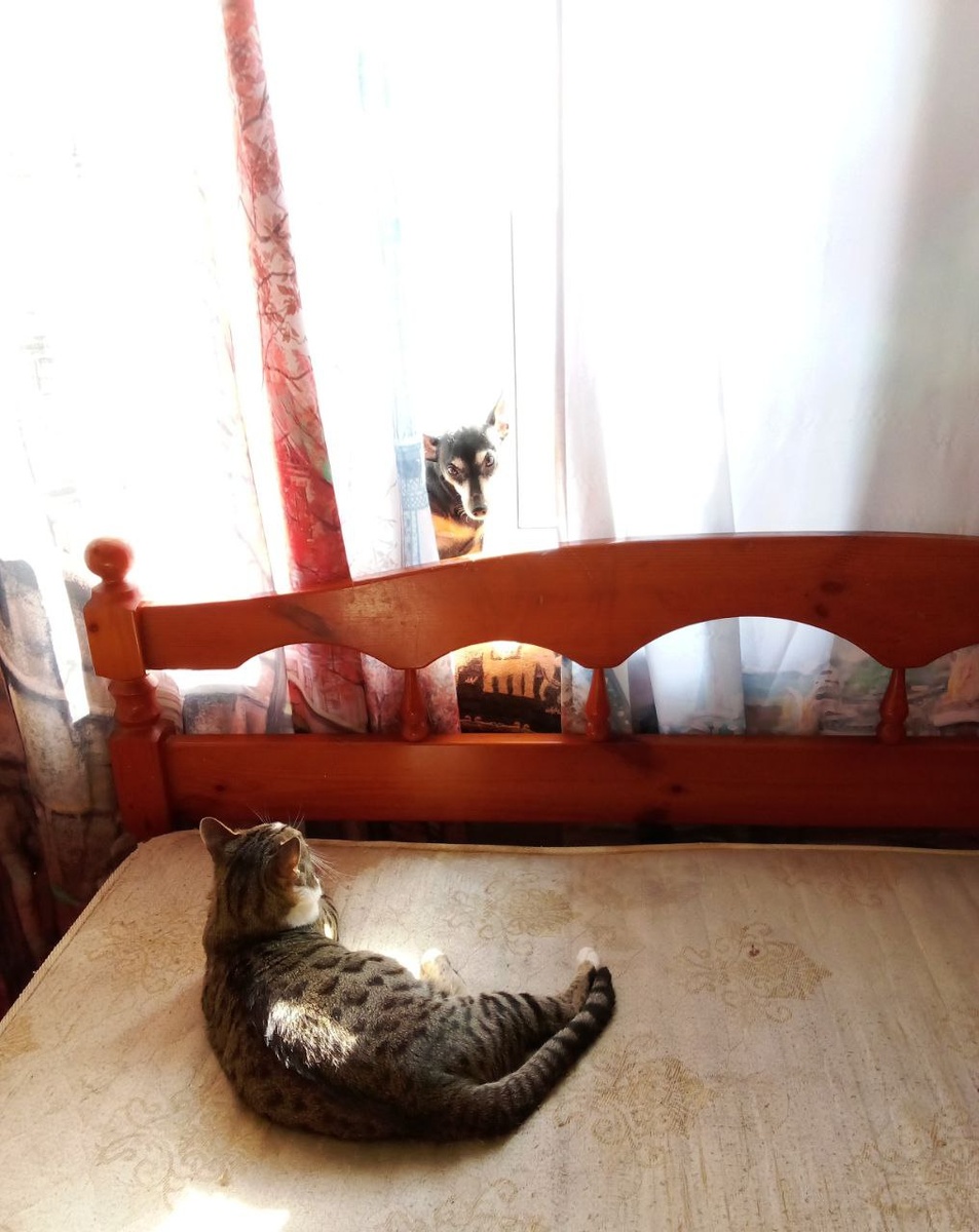 Знакомьтесь это наши младшенькие одногодки — кот Бутуз это первый мой кот, который у нас с рождения и Маня — цвергпинчер, которую мы забрали у отказавшихся от нее бывших непутевых хозяев. И вот эта парочка у нас живет точно как кошка с собакой😂 И вот один из эпизодов их взаимоотношений: На фото мы можем видеть как Маня решив погреться на солнышке запрыгнула по подоконник к котам, пока они потчевали завтраком. И вот вернувшись и обнаружив такую картину котик загнал Маню в ловушку— просто перегородив ей выход, без шанса выбраться из западни без поцарапанных ушей🔥 Чем сие противостояние закончилось я не увидела — убежав на работу🤔