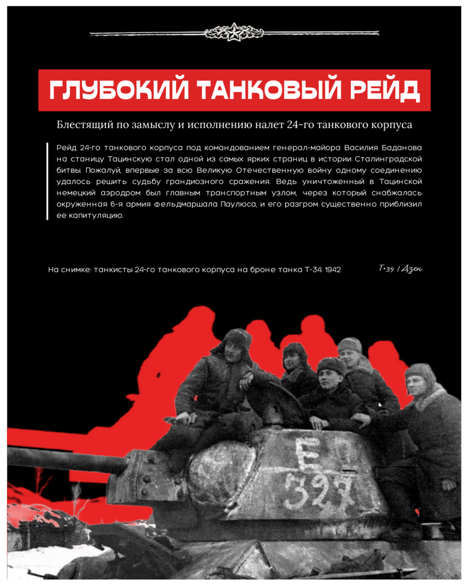 24-й танковый корпус (командир генерал-майор танковых войск Б. М. Баданов) имел особую задачу. Он должен был совершить глубокий рейд в тыл врага и нанести внезапный удар по железнодорожной станции и поселку Тацинская, возле которого располагался крупный аэродром. Отсюда гитлеровские самолеты непрерывно доставляли окруженным войскам генерала Паулюса боеприпасы и продовольствие.
