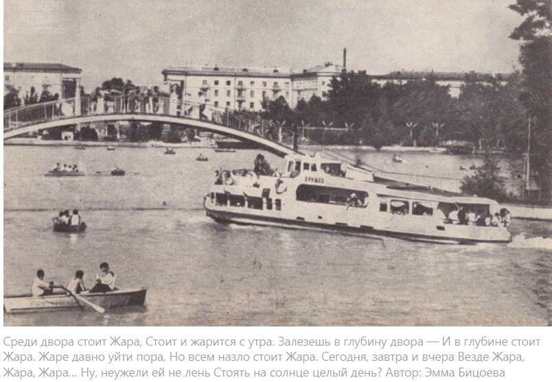 Да базары того времени это одно а вот озёра это и правда отдельный мир, мир запаха водорослей прохлады и чего-ьо особенного на пляже песок горячий но ляжешь на него он сверху горячий чуть верхний слой отбросишь и там теплый. Поглубже копнешь а там влажный песок. Были любители сидеть у води и капая мокрым песком создавать интересные сооружения, а волны от несущихся моторок или проплывающего огромного корабля... Забраться на десяти - метровую вышку вид отуда захватывающие зрелище, ощущение что все озеро и даже Беш-Агач у твоих ног, а потом видя что присматривающий за вышкой лезет наверх, а он шутить не будет и заставит прыгать. От безвыходности сигать в воду и почувствовать что вода не столь мягкая и податливая. Было и такое в одно из посещений озера после выхода из воды обнаружил что штаны украли. Таким делом промышляли старогородские пацаны узбечата. Что делать, хорошо деньги спрятал, пришлось идти покупать самые дешовые брюки в магазине на остановке. Стоили эти брюки из хлопка где-то два рубля. Представляете зрелище, огромный парень в плавках, призрев улыбки окружающих, тихо шествует сквозь толпу людей в магазин. Продавцы отнеслись с пониманием хотя и не без улыбок.