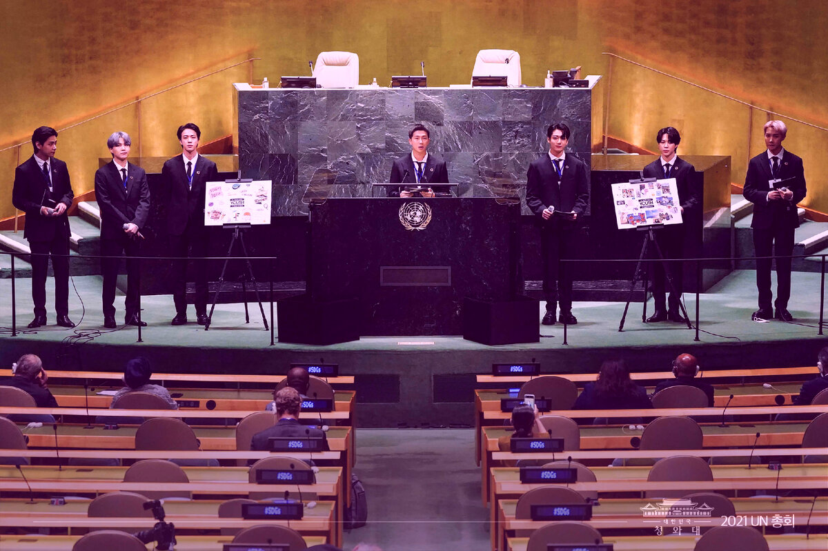 ⠀⠀Тот факт, что они были самой популярной айдол-группой в мире, имели возможность сотрудничать с Coldplay и были приглашены выступить в ООН, означал, что группа могла стать точкой входа практически во все сферы жизни. Презентация в ООН стала примером того, как BTS могут использовать свое влияние в положительных целях. Об этом говорит SUGA: