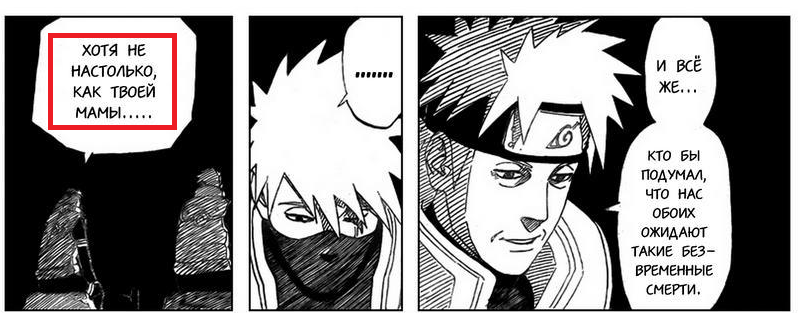 - В манге же Какаши, без всех этих прелюдий, сразу заявляет, что он гордится своим отцом и точка!