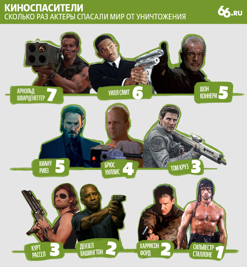 Всемогущий Брюс спасал мир всего четырежды, а его друг и коллега по красной ковровой дорожке Киану Ривз имеет в своем активе пять спасений. Дышат Брюсу в затылок Том Круз, Курт Рассел, Харрисон Форд, Сильвестр Сталлоне и Дензел Вашингтон. А лидерами списка по праву являются заслуженные артисты Арнольд Шварценеггер и Уилл Смит.