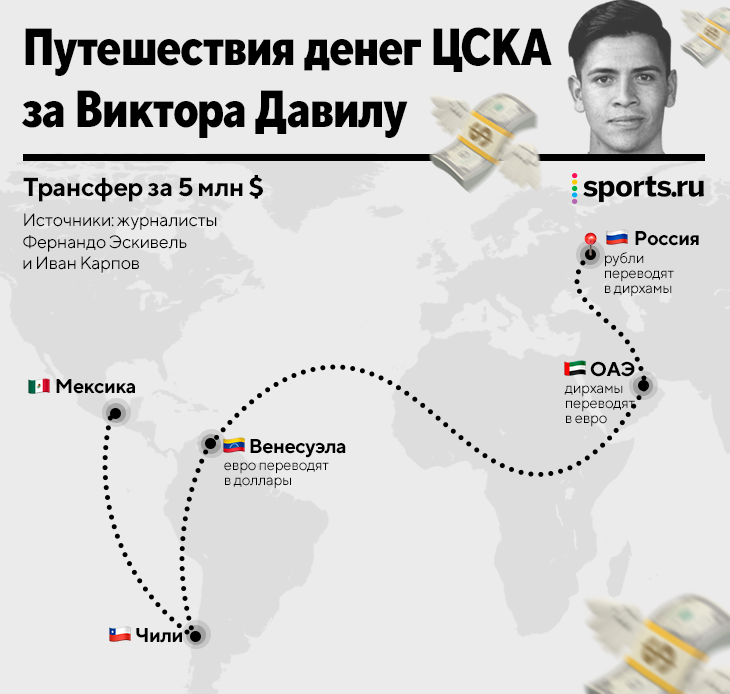🇷🇺➡️🇦🇪➡️🇻🇪➡️🇨🇱➡️🇲🇽 ЦСКА все-таки нашел способ заплатить за чилийского нападающего Виктора Давилу. Правда, 5 млн долларов для «Леона» проследуют по очень извилистому маршруту. ЦСКА платит через 5 стран! Отправит в рублях, а «Леон» получит их в долларах Журналист Фернандо Эскивель назвал такую схему: из России деньги переведут в Венесуэлу, затем – в Чили, а уже потом в Мексику. Инсайдер Иван Карпов подтвердил эти сведения, но добавил, что сделка будет еще сложнее. Маршрут 5 млн от ЦСКА можно проследить на картинке – действительно впечатляет. Сначала рубли в России переведут в дирхамы и отправят в ОАЭ. Там их конвертируют в евро и доставят в Венесуэлу, где деньги примет агентство «Эвертон-де-Винья». Оттуда они уже в долларах отправятся в Чили, а потом – в Мексику. «Леон» получит 5 млн долларов через Давилу – нападающий выкупит себя уже на этой неделе. Виктор уже прошел медосмотр для ЦСКА, его контракт с московским клубом будет рассчитан на 4 года. Давила не сразу нашел себя в Ме