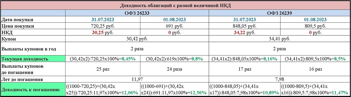 Во многих источниках пишут, что величина накопленного купонного дохода (НКД) не имеет значения при покупке облигации, так как компенсируется первым же выплаченным купоном. Давайте проверим, влияет ли величина НКД на доходность облигации. Второго августа был выплачен купон по двум выпускам ОФЗ 26233 и ОФЗ 26239. До выплаты купона 31 июля мы могли купить эти облигации по цене 720,25 руб. и 848,05 руб. соответственно. В этот же день НКД составлял у ОФЗ 26233 - 30,25 руб. при купоне 30,42 руб., а у ОФЗ 26239 - 34,22 руб. при купоне 34,41 руб. На следующий день 1 августа по обеим облигациям НКД стал 0 рублей. Купить их можно было ОФЗ 26233 за 691 руб., а ОФЗ 26239 за 809,5 руб. См. скриншоты. Если бы мы приобрели эти облигации 31 июля, то текущая доходность (величина ежегодных выплат к текущей цене облигации) составила бы: по ОФЗ 26233 - 8,45% годовых, а по ОФЗ 26239 - 8,16% годовых. См. расчёты. Доходность к погашению этих облигаций при цене покупки, которая была 31 июля и с учётом того