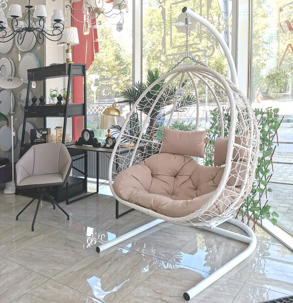 В интерьерном центре Уют Холл представлены подвесные кресла в разных цветовых решениях: любимый белый кокон на двоих с удобнейшими подушками нежного цвета капучино или благородный шоколадный цвет кокона и подушек.