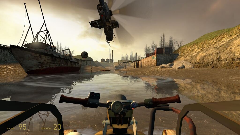 Продолжаю играть во второй Халф Лайф. Игрушка все еще удивляет своим разнообразием. Я, уже, как-то, его себе представляю. Типа оранжевое все такое, индустриальные здания, провинция. Вода, река. Вроде, все идет в таком ключе. А вот новости. Тут есть снова эпизоды на транспорте. На водном катере, на багги. То есть ездить по открытым пространствам тут тоже надо приличное количество времени. Потом, смена полная локаций – на зомби шутер. Это область Ривенхольм. Мы не ходим в Ривенхольм называется часть игры. И все это второй Халф Лайф. Очень разнообразный и довольно разный. Сначала, езда на водном катере. С установленной на него пушкой. Сражение с вертолетом противника. Вода сделана тут очень красивою. Такие задачки, как проплыть дальше тут. Есть развилки, ведущие в тупики. Но все равно, ты исследуешь тут реку. И ее окрестности. Это очень увлекает. Создается ощущение огромного мира. В котором ты уже даже освоился. И активно взаимодействуешь. Плотина тут какая-то есть. Бросаешь катер, ид