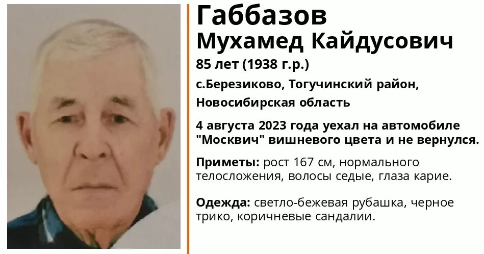 В селе Березиково Тогучинского района Новосибирской области пропал 85-летний Мухамед Габбазов. В поисково-спасательном отряде «ЛизаАлерт» сообщили, что дедушка 4 августа уехал на «Москвиче» вишнёвого цвета и обратно не вернулся.